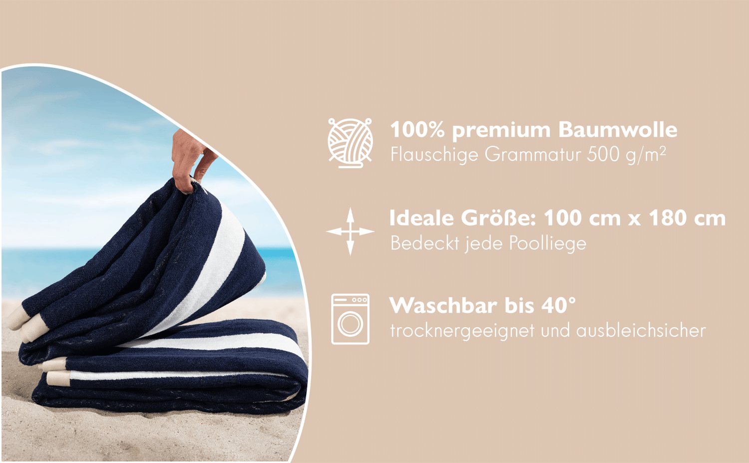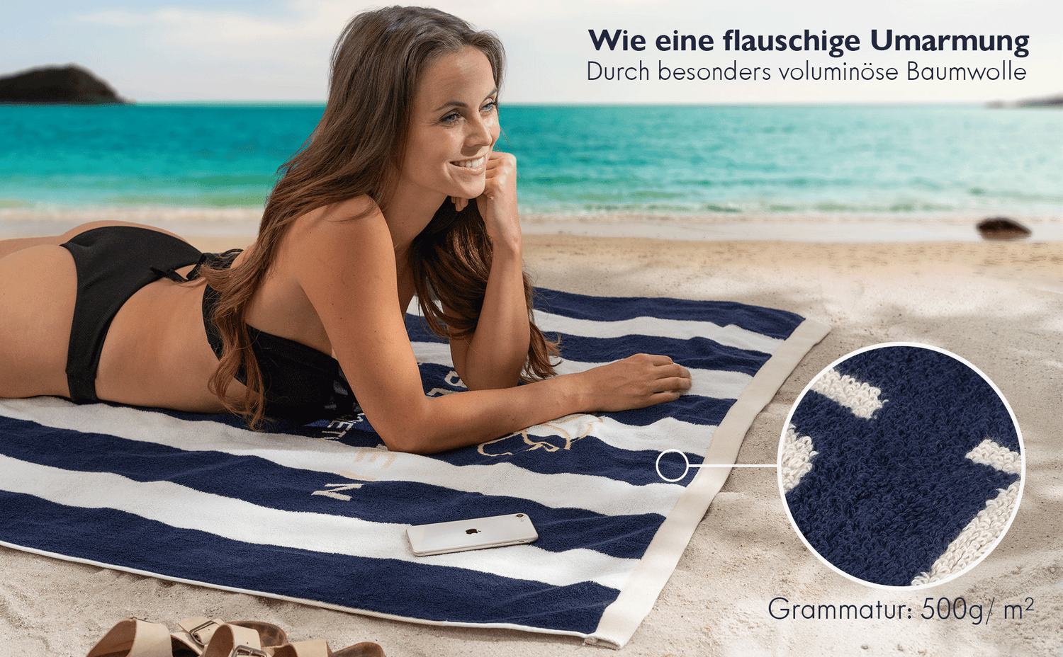 ⚪ PURER KOMFORT - Das Strandtuch hat mit 100x180 cm eine perfekte Größe für die Verwendung am Strand oder Pool und garantiert damit genug Auflagefläche für den ganzen Körper. Mit einem Gewicht von 500 g/m² bietet das kuschelige Badetuch unvergleichliche Weichheit und garantiert höchsten Komfort für deine Auszeit in der Sonne.