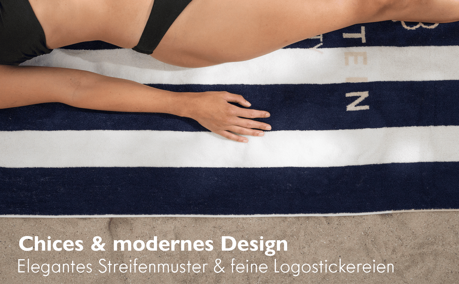 ⚪ CHICES DESIGN – mit einem modernen und exklusiven Design ist das Strandhandtuch dein “Must Have” für den nächsten Urlaub. Das Beach Towel präsentiert sich mit einem eleganten Streifenmuster, feinen Logostickereien und abgerundet durch eine geschmackvolle Bordüre als Hingucker am Strand oder im Beach Club.