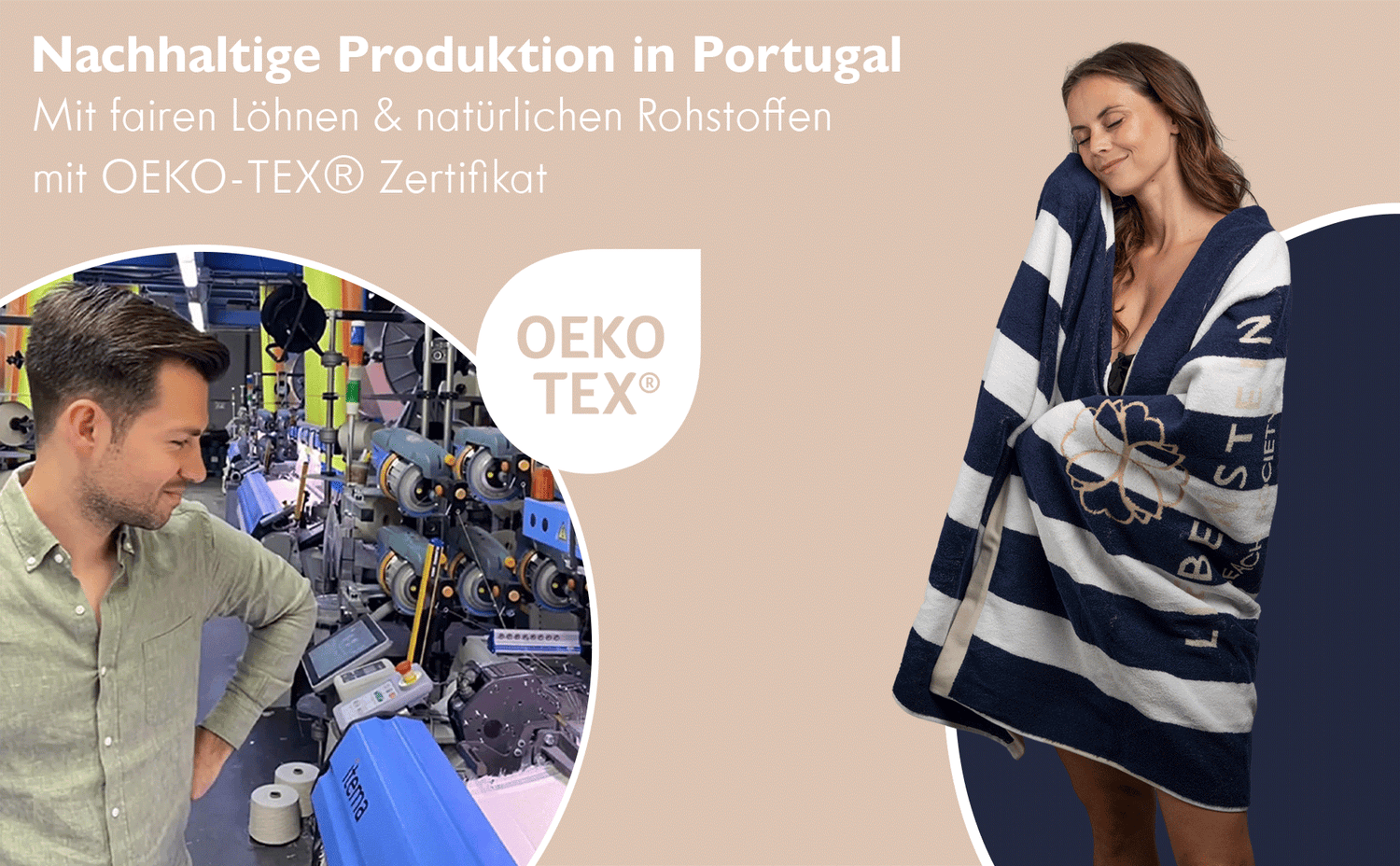 ⚪ FAIR UND NACHHALTIG - Faire und nachhaltige Produktion unserer exklusiven Strandtücher “Made in Portugal” mit kurzen Transportwegen, fairen Löhnen und natürlichen Rohstoffen mit OEKO-TEX Zertifikat sowie nachhaltiger Wertschöpfungskette.